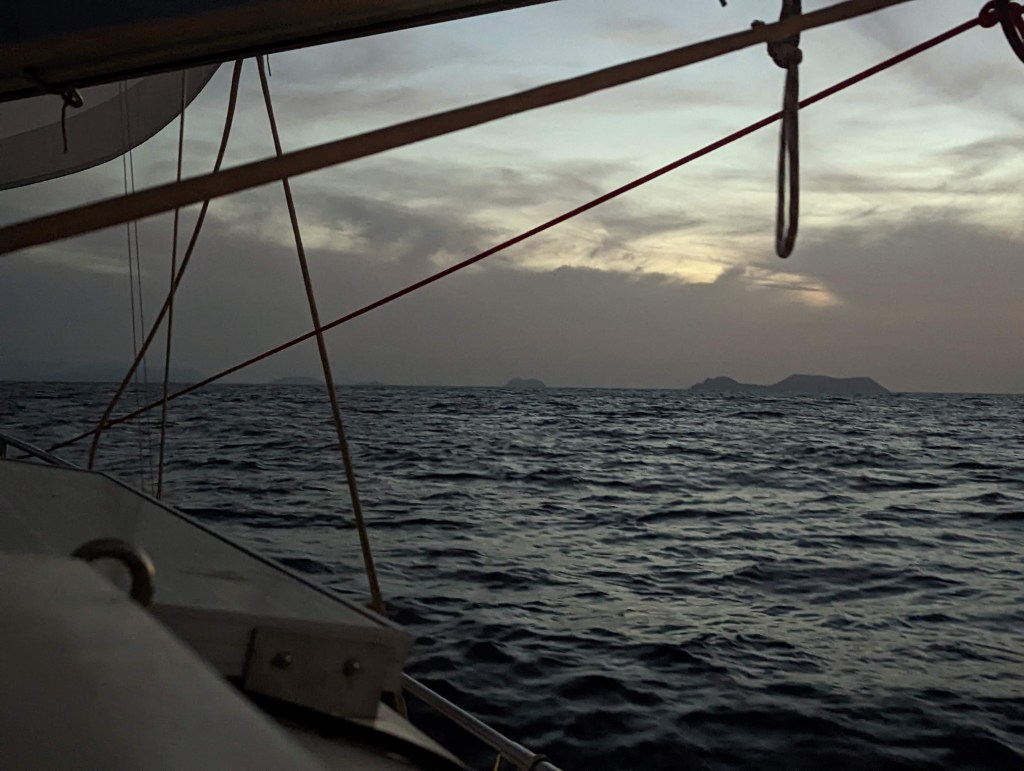 Pas zodra we land in zicht zien, trekt de wind echt aan. In het donker laten we ons anker vallen en het waait harder dan we de hele vaartocht hebben meegemaakt. Is het niet ironisch, denk je niet? Nou ja, we zijn er.