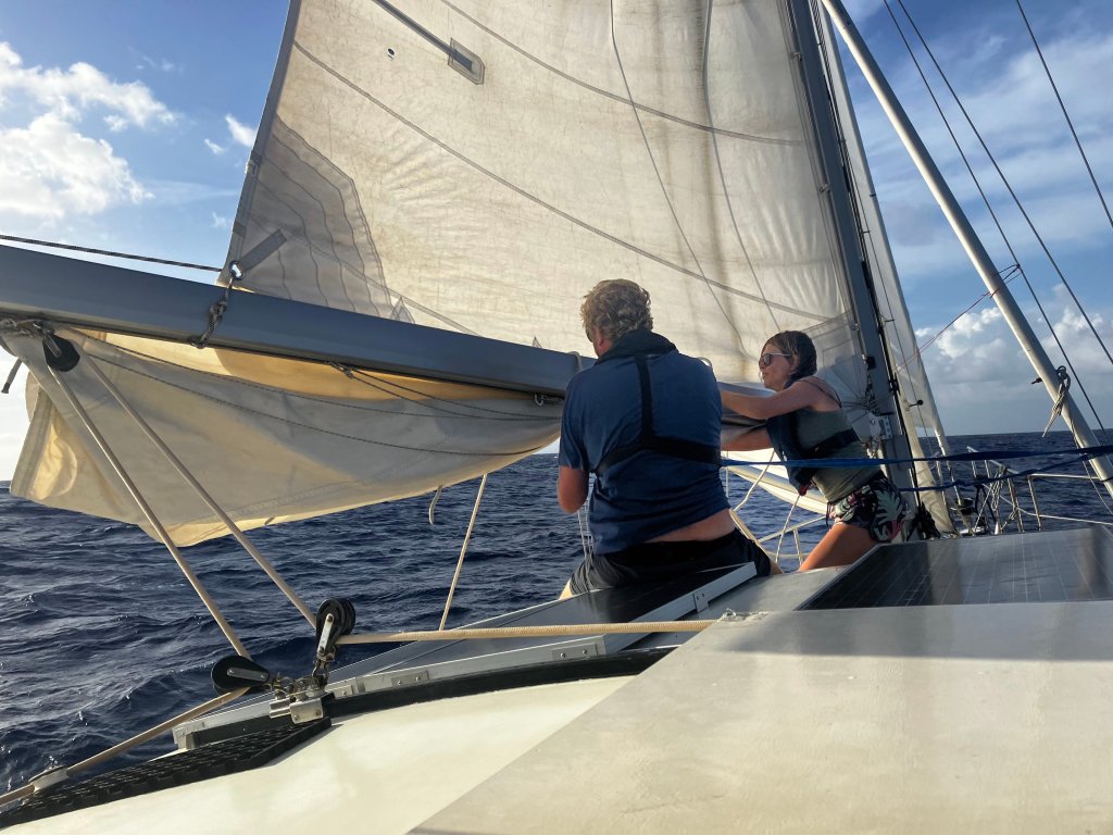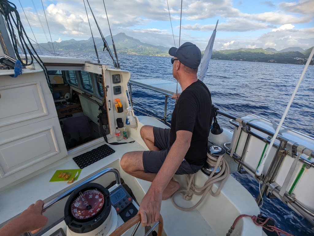 De wind neemt toe en tijdens mijn dienst rond 3.00 uur in de nacht komt Jouke polshoogte nemen. Ik zie de windmeter schieten naar 30 knopen wind. We hebben nog heel wat voor de boeg en de koers die we na Guadeloupe moeten varen is heel strak aan de wind. En dan is het nog de vraag of we het in een rak kunnen halen. We hebben de zeilen maximaal gereefd. Om nog minder wind te vangen zouden we de bezaan naar beneden moeten halen. Dat maakt de reis niet gemakkelijker omdat we door de druk van de zeilen stabieler op het water liggen. Hoe minder zeil, hoe meer de golven vat krijgen op de boot. We besluiten de koers te wijzigen. We zijn Guadeloupe nog net niet voorbij en zoeken een mooie baai bij dit eiland. Jouke kijkt op zijn telefoon en zoekt een geschikte plek in het holst van de nacht om te ankeren. Hierbij is het van belang dat er niet te veel deining is voor de beste dagrust en of de bodem geschikt om het anker te laten grijpen. Via het internet zijn alle locatie beschreven en kan men via referenties bepalen wat de meest geschikte plek is. Ik vind het heel bijzonder dat je midden op zee bereik met de telefoon hebt.