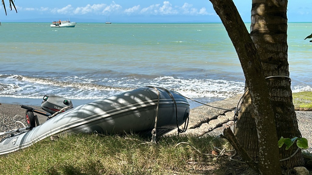 Met het nieuwe rubberbootje en de nieuwe buitenboordmotor vliegen we de volgende ochtend zo snel mogelijk naar het strand. Het is er rustig, maar we zijn niet alleen.