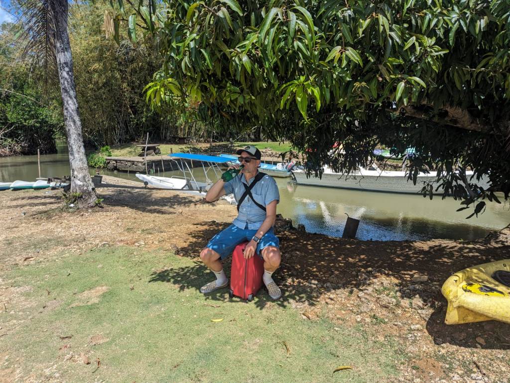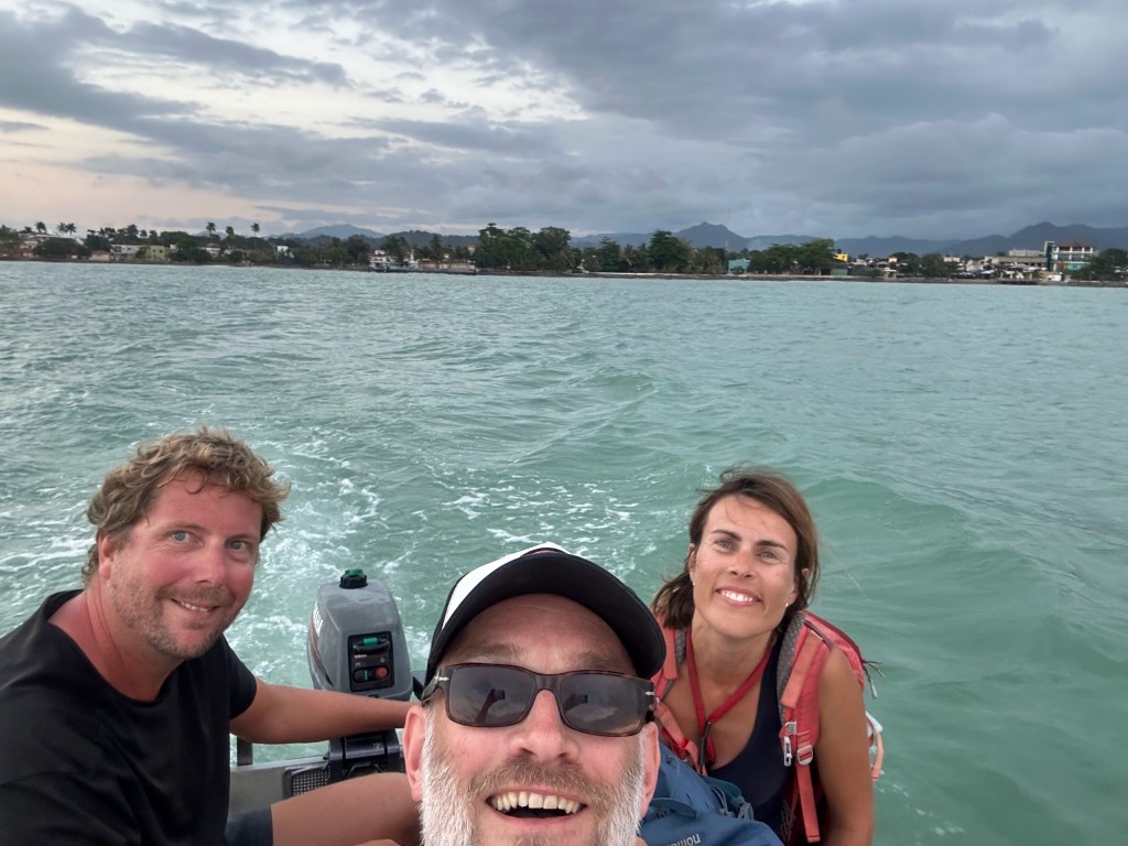 Jouke en Pleuni brengen mij die laatste ochtend met mijn zware koffer naar de kant. Nog één keertje met het rubberbootje door de mangrove. Jouke en Pleuni gaan nog een dagje chillen in het resort. Ze willen niet te lang bij het steigertje staan wachten, want het liefst blijven ze de Armada nog even ontwijken.