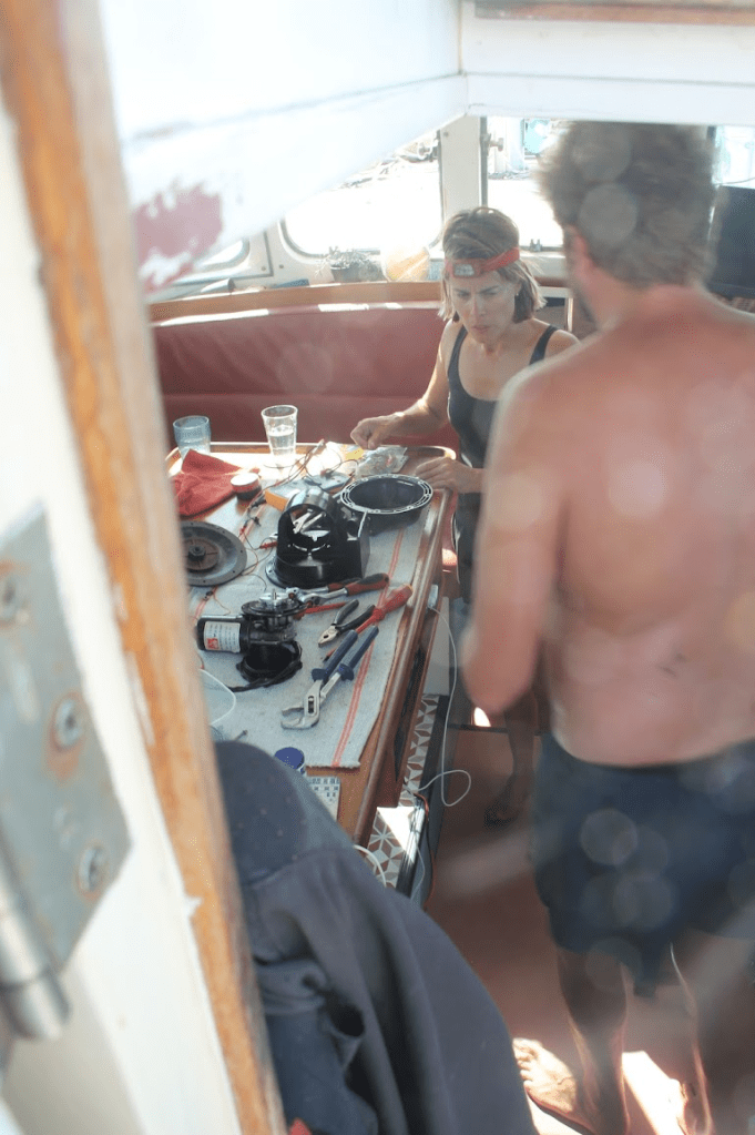 De volgende ochtend is er een klusje te doen. Eén van onderdelen die ik meegenomen heb uit Nederland hoort thuis in de vuilwaterpomp. Aan boord zit een grote tank met al het afvalwater uit de gootsteen, maar ook uit de wc. Die tank kan geleegd met een pomp, maar die pomp heeft een mankement. Dit geeft veel gedoe, en met dit hele kleine onderdeeltje uit Nederland kan dit eindelijk gerepareerd worden. Voor deze klus moet de pomp wel losgekoppeld worden en uit elkaar gehaald.