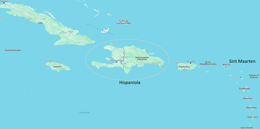 Hispaniola met Haïti en Dominicaanse Republiek. Een stukje groter dan St. Maarten