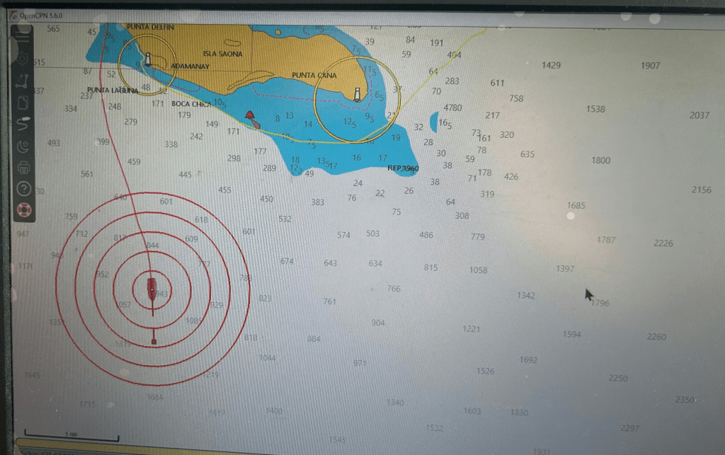 De volgende ochtend moeten er een aantal dingen geregeld worden. Pleuni en ik gaan naar het havenkantoor en Jouke krijgt aan boord officieel bezoek van de Armada, de Marine. De regels zijn ons nooit helemaal duidelijk geworden, maar blijkbaar wil de Armada graag op de hoogte blijven van ons komen en gaan langs de kust van hun land. Het resultaat van dit officiële bezoek aan boord is een formeel papier, een dispachio, met de datum van ons vertrek van Punta Cana en onze geplande bestemming, Isla Saona!