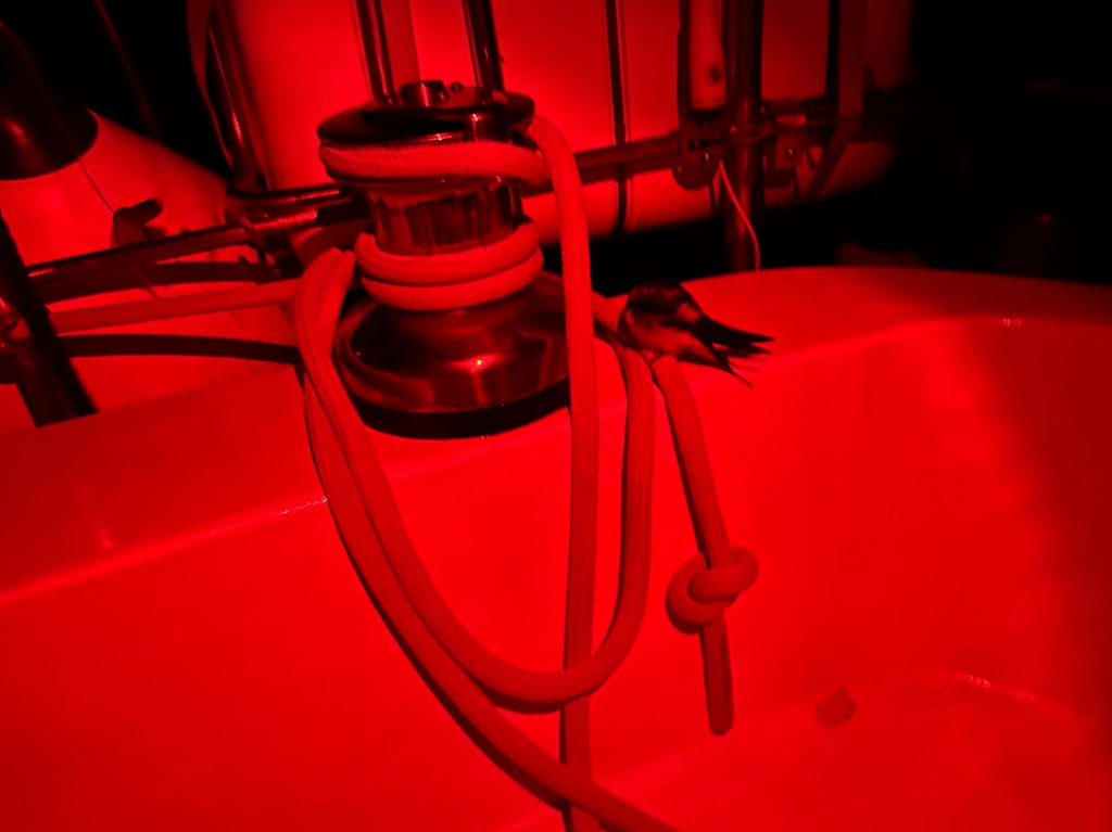 Het begint donker te worden en we zijn een flink stuk uit de kust, geen land meer in zicht. Een vogeltje komt uitrusten onder de lijntjes van de stuurinrichting. Het lijkt wel een boerenzwaluw.