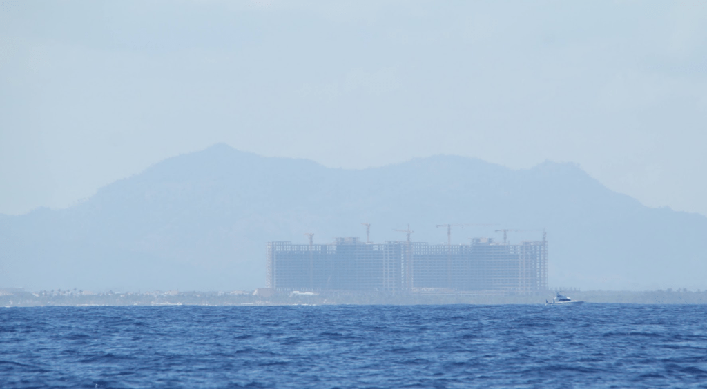 We varen inmiddels de hele tijd met de kust in zicht. We zien hoe er veel gebouwd wordt langs de kustlijn. Waarschijnlijk allemaal grote vakantieresorts. Van een afstandje zien we het vakantieplezier. Sportvisboten en paragliders voortgetrokken door speedboten.