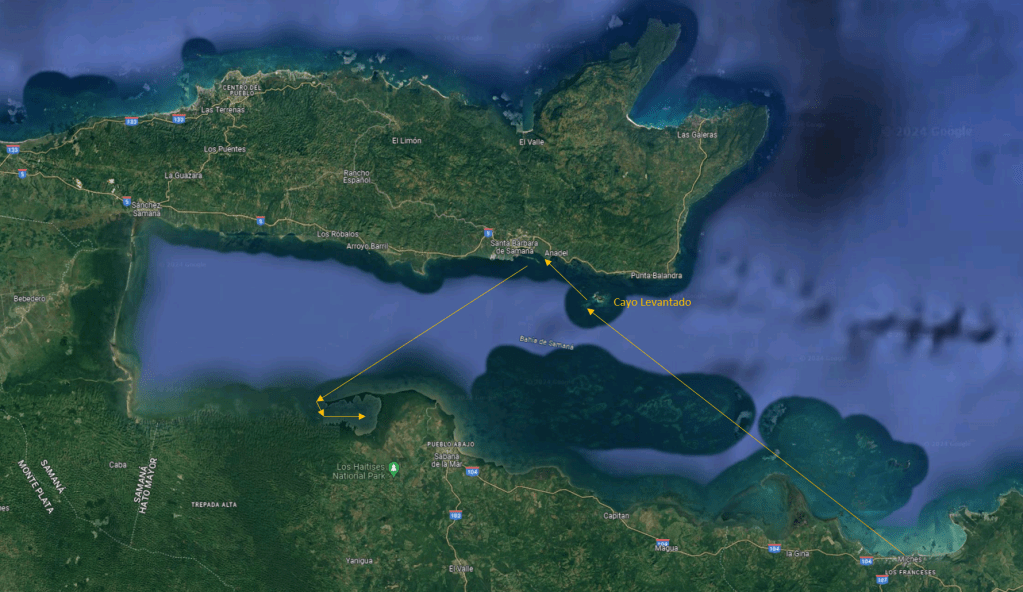 Vanuit Miches gaan we op weg naar Caya Levantado en varen dus nu echt de baai in.