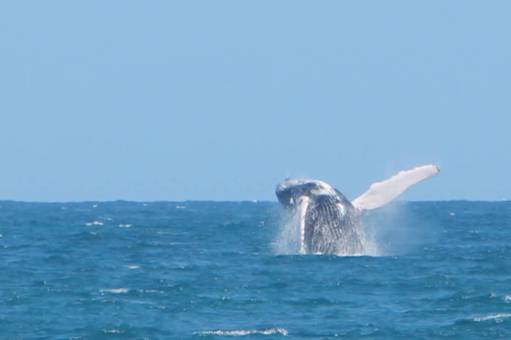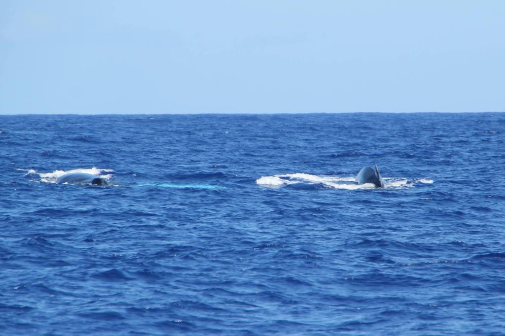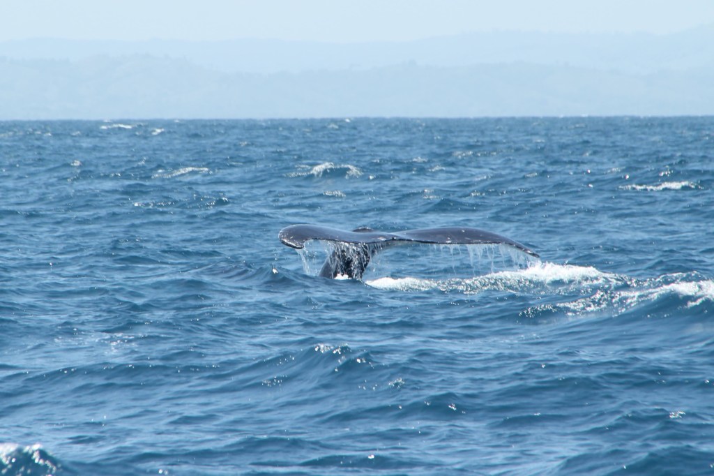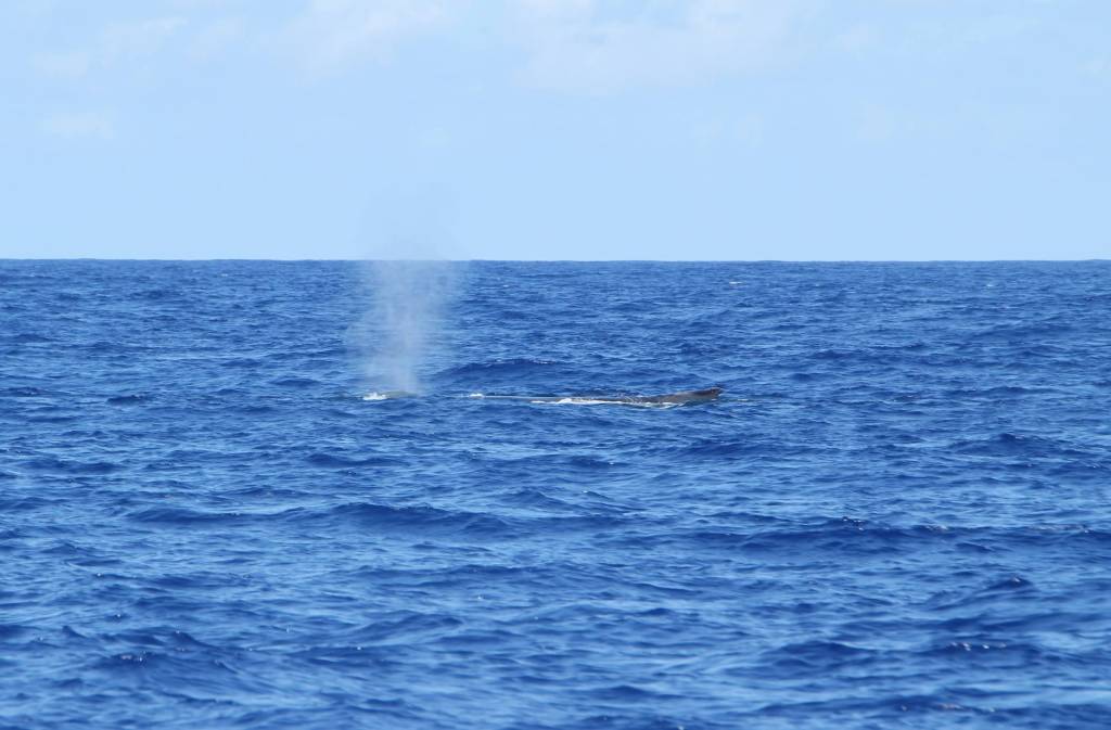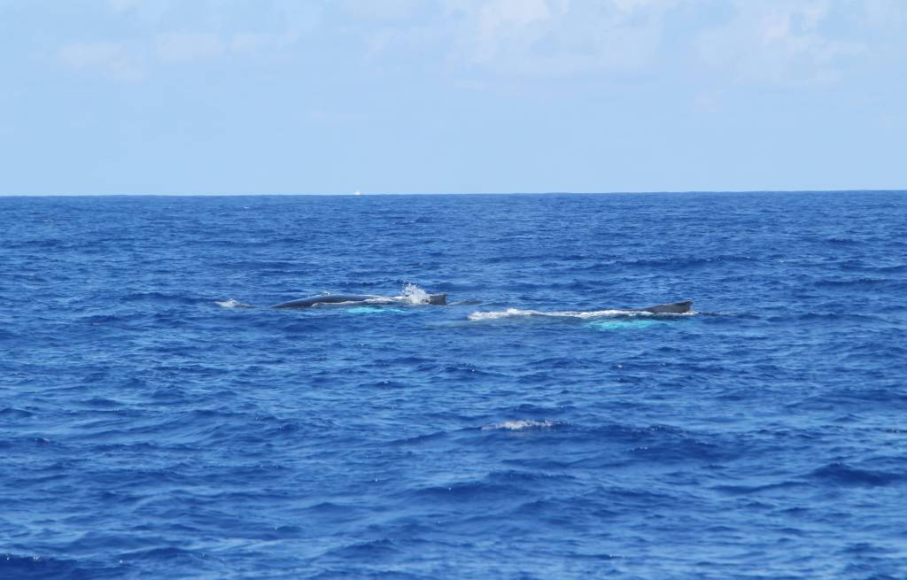 Ja daar! Echt vlak naast de boot. Ze blijft daar een tijdje zwemmen. We zien de karakteristieke bult op haar rug boven water komen, dan samen met de rugvin, en daarna komt die enorme staart boven water. Een prachtige golvende beweging. We kunnen de knobbels op de staart zien zitten. Door het heldere water heen zien we dat het onderlijf veel lichter van kleur is.