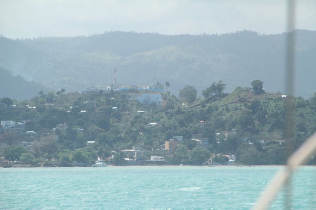 Na twee nachten op het Bacardi eiland willen we wel weer eens de wal op. De voorraad verse groenten en fruit raakt op. Het is maar een klein stukje naar Santa Bárbara de Samaná. We varen met alleen het voorzeil op. Later blijkt dat we gekiekt zijn terwijl we zeilend de baai in kwamen.