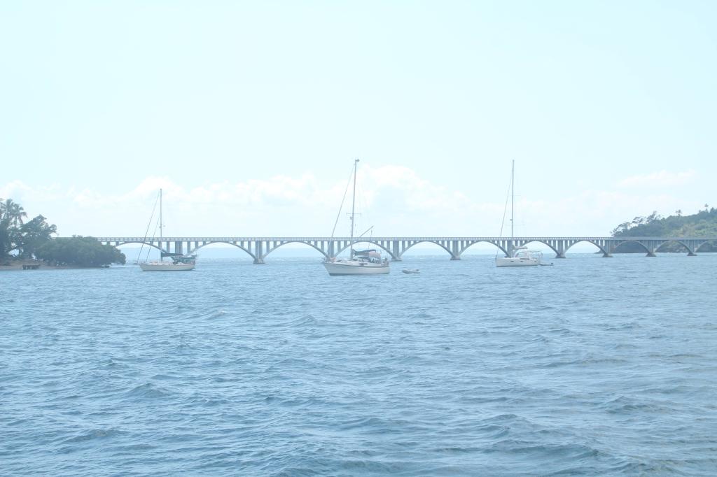 Hier zijn minder golven, maar het stinkt behoorlijk. Dat komt door de lagune met mangrovebos. Het liefst zouden we naar de lagune en het dorpje toe kunnen wandelen vanaf onze ankerplek, maar door deze geur besluiten we toch nog wat verder naar het westen door te varen.