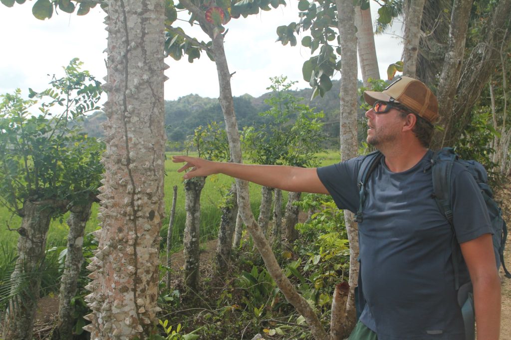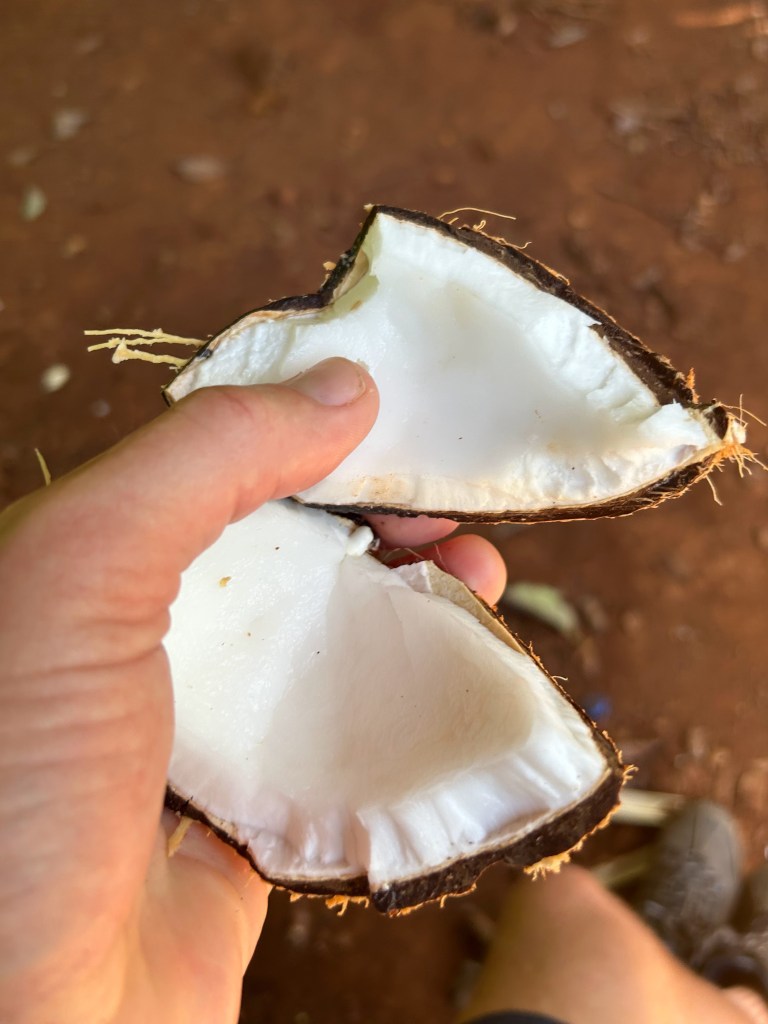 Er wordt een kokosnoot voor ons opengeslagen en we kunnen even uitrusten van onze wandeling met een frisse slok kokosmelk. We nemen het kokosvlees mee als snack voor onderweg. Het wandelpad dat ons door het bos leidt wordt waarschijnlijk door de machetes van deze twee mannen begaanbaar gehouden.