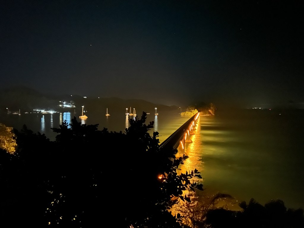 Nadat we goed achter het anker liggen willen we aan wal. We besluiten niet met het rubberbootje naar de gebruikelijke dinghy-dock te varen, maar eerst een wandeling te maken over de pier en loopbrug die deze baai omringt. Het is een prachtig stukje moderne architectuur. We vermoeden dat het ook een militaire functie heeft gehad. Het is in ieder geval een constructie met prachtige uitzichten.