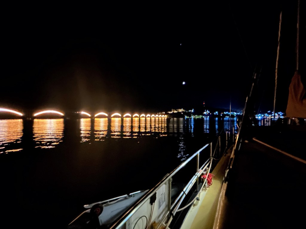 Zo nu en dan zie ik nieuwe lichtjes aan de horizon. Ik kan dan op de digitale boordnavigatie zien wat voor soort schip dat is, en of er een kans is dat we daar te dicht in de buurt zullen komen als we beide onze koers zouden aanhouden. Het zijn stuk voor stuk allemaal hele grote vracht- of cruiseschepen. Ze zijn op één hand te tellen en ze komen bij lange na niet in de buurt. Andere plezierbootjes kom ik deze nacht niet tegen op het scherm.