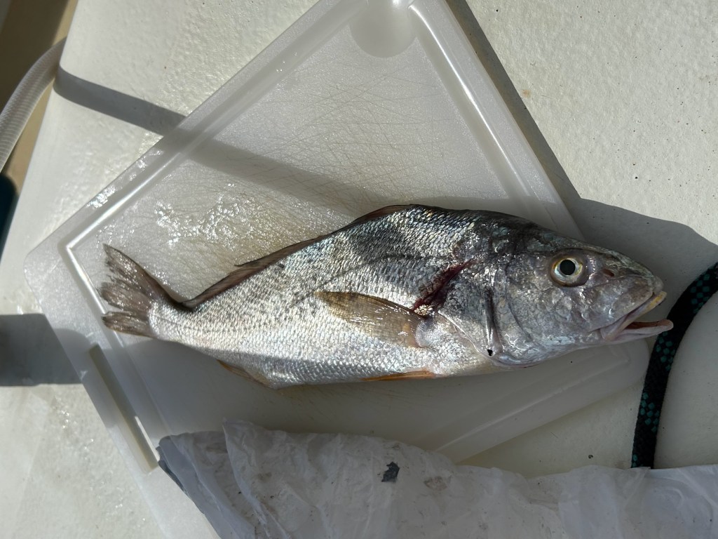 Helaas zien we alleen maar een paar hele kleine visjes in hun bootje liggen. De moeite van het klaarmaken niet waard. Die hoeven we niet.