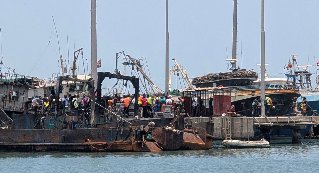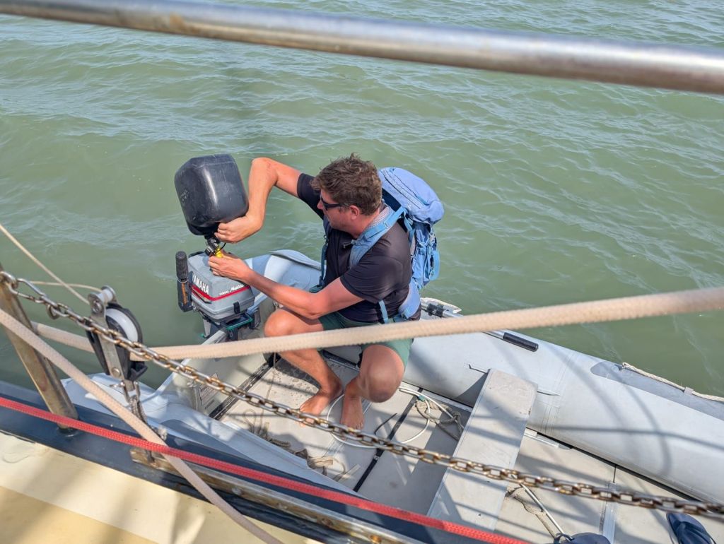 Wat we de volgende dag als eerste moeten doen, is inklaren. We varen met onze bijboot langs oude, verroeste Nederlandse ponten en sleepboten die hier al even voor anker lijken te liggen. ‘Hello! Hello! Hello!’ Vanaf een ooit Workums vissersschip roept een magere man ons toe. ‘Do you have water for me?’ We geven hem een flesje water en vragen naar de herkomst van het schip. Helaas begrijpen we elkaar niet goed. Om de miscommunicatie te stoppen wensen we hem een fijne dag en varen we verder.