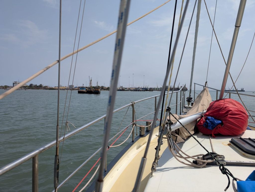 De hele tocht stroomt het fors de kant op die wij op willen, we hebben goede wind en een mooie vaart. Het tempo zit erin. Omdat we per se bij daglicht willen aankomen om de vele wrakken in de baai te kunnen ontwijken, vertragen we op de een na laatste dag. We varen nu westwaarts om een omweg te maken. Maar de extra mijlen blijken niet genoeg te zijn. Daarom halen we het grootzeil op de laatste dag naar beneden. ‘Nu komt het zeker goed, we zullen niet midden in de nacht aankomen,’ zeggen we tegen elkaar. Niet wetende dat de wind erna behoorlijk inzakt. Oh nee, nu komen we niet overdag maar in de avond aan! Snel trekken we het lichtweerzeil omhoog, zodat we vaart blijven houden en we het precies redden om vóór het vallen van de avond ons anker te laten zakken in de industriële haven van de stoffige stad Banjul. We zijn er!