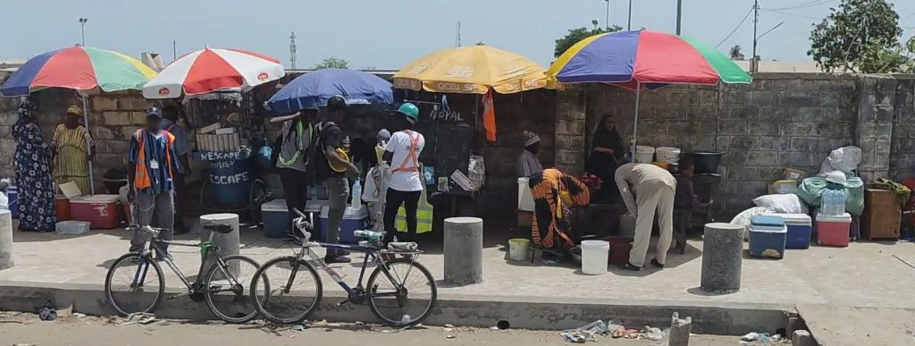Nu gaan we geld wisselen en een sim-kaart kopen. Terwijl we door de levendige straten van Banjul lopen, kijken we goed om ons heen op zoek naar eettentjes. Het stikt er van de zaakjes met visgerei, straatverkopers met Westerse kleding, schoenmakers, naaiateliers, moskeeën maar een lunchtentje of restaurant zien we niet. ‘Niemand op straat zie ik ook eten of drinken.’ ‘Nu je het zegt, terwijl het behoorlijk warm is.’ Op de achtergrond horen we ‘Allah Akbar’ galmen terwijl mannen hun gezicht wassen met water uit een grote plastic theepot en zich bukken om te bidden.