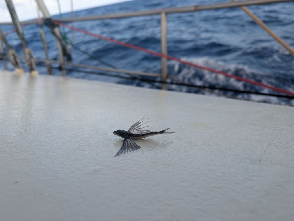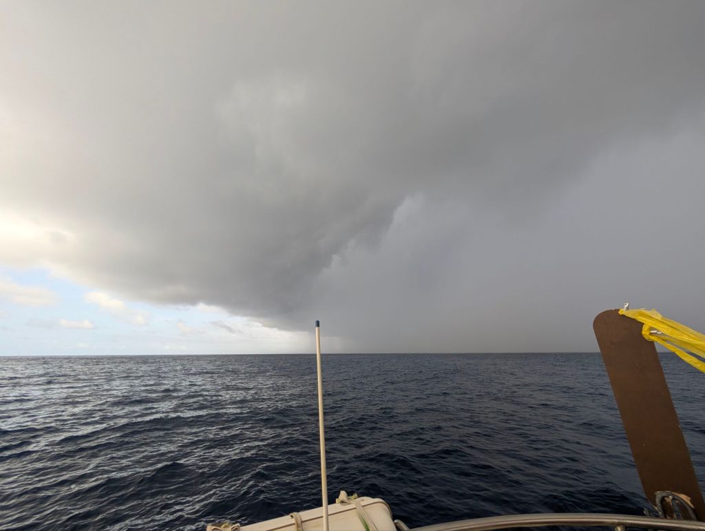 Zo dynamisch als de eerste dag was, zo weinig spannends gebeurt er de dagen erop. We varen pal zuid, richting de evenaar. En zo’n zeven graden boven de evenaar komen we in de befaamde windstilte terecht. De wind kakt in en op de vijfde dag maken we een voortgang van maar 66 mijl. De dag erna gaan we zelfs maar 44 mijl vooruit. En de dag daarna nog maar 34 mijl. We zweten ons suf, het is hartstikke warm en benauwd. Af en toe komt er een squall voorbij, een onweersbui met gelukkig een beetje wind.