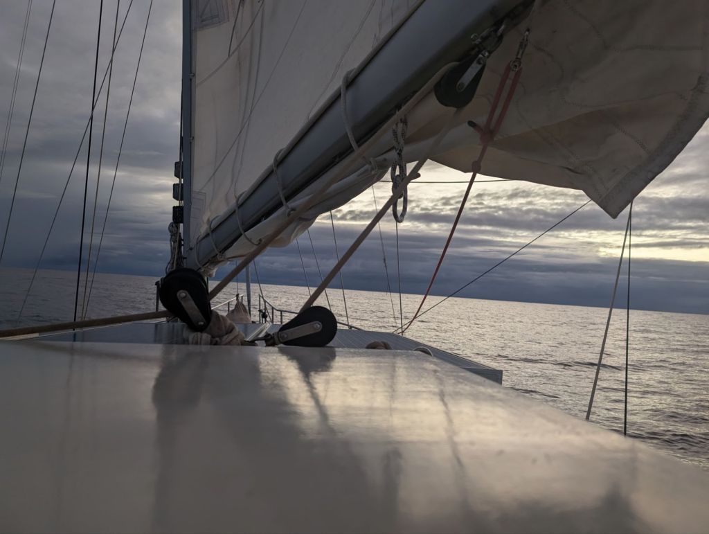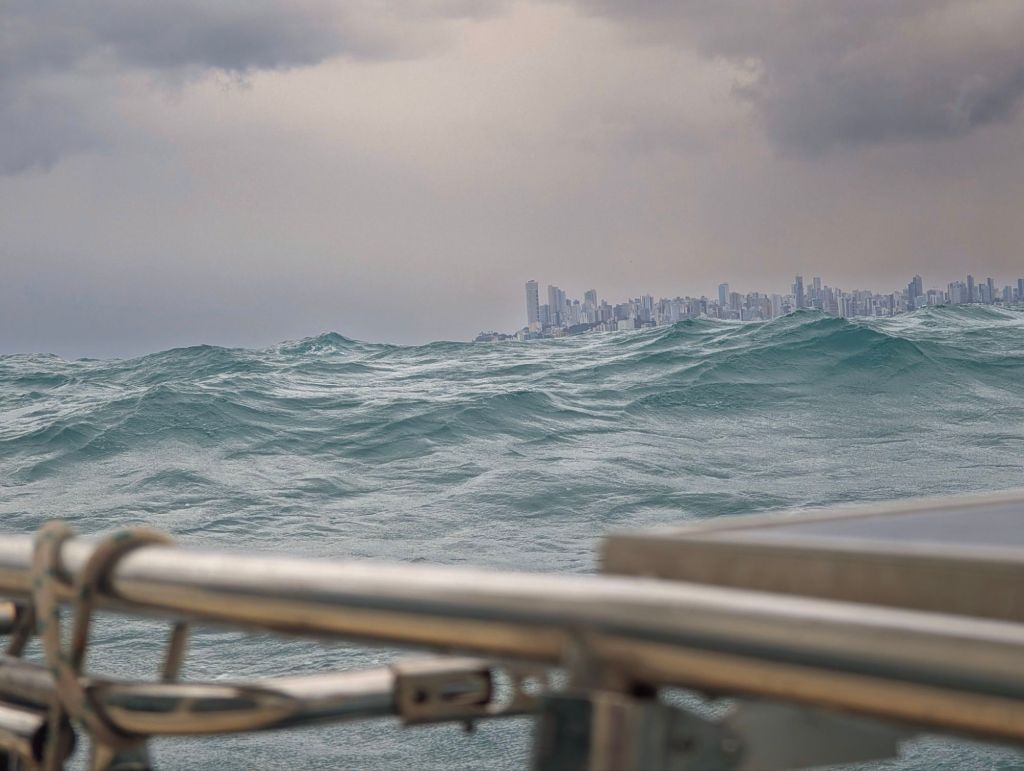 Maar we beginnen te vroeg terug te blikken. We zijn er nog niet… de wind begint steeds meer aan te trekken en verandert van richting. We moeten scherper en scherper varen, de boot gaat steeds schuiner. Om vaart te kunnen houden hebben we zowel de genua als de kotterfok omhoog. Maar de onweersbuien nemen ook toe. Hierin zit zoveel wind dat we bij elke squall helemaal plat lijken te liggen. Twaalf knopen zie ik op de snelheidsmeter, dit gaat veel te ruig. Het regent hard en golven denderen over ons heen. De laatste twee nachten brengen we samen in het dekhuis door, het is te ontstuimig om de nachtdiensten alleen te draaien. Koken lukt niet, gelukkig vinden we nog pakken mueslirepen. Zelfs de vieze met bananensmaak gaan op. Nu er zo veel water over de boot komt, zien we dat het water via de ramen van het dekhuis naar binnenkomt. Oh nee, lekkages! Door verouderde kit bij de dekramen zijn er waarschijnlijk kieren ontstaan waardoor het nu onder de ramen lekt. Wanneer is deze ellende voorbij? Oh wat kijken we ernaar uit als we er zijn. De wind blijft maar aantrekken en de golven worden hoger en hoger. Ik tel de mijlen af.