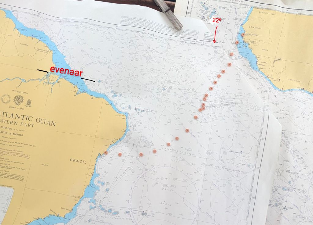 Je denkt wellicht: waarom varen ze langs de kust? Ze gaan toch de oceaan oversteken? Om op de gewenste plek in Brazilië uit te komen, kunnen we niet in een rechte lijn op ons doel af varen. De doldrums, grote windstiltegebieden, en fikse westwaartse stroming vlak onder de evenaar zorgen ervoor dat we strategisch te werk moeten gaan. We hebben een aanpak gekozen: we gaan zo oostelijk mogelijk de evenaar over. Niet meer dan 22 breedte graden. Het nadeel van deze koers is dat hoe dichter bij Afrika hoe groter de doldrums zijn. Want als we al eerder koers zouden zetten naar Brazilië zouden we minder last hebben van de doldrums. Maar het nadeel is dan weer dat we door de stroming vlak onder de evenaar meteen naar westen geduwd worden en te noordelijk uitkomen. Onze boot blinkt niet uit in scherp aan de wind varen, wat betekent dat we in Brazilië veel moeite gaan hebben om nog naar Salvador te komen. Wie weet komen we er wel helemaal niet! Van meerdere zeilboten hebben we al gehoord dat het ze niet gelukt is om op de gewenste plek uit te komen. We zakken dus eerst de Afrikaanse kust af, voordat we echt gaan oversteken.