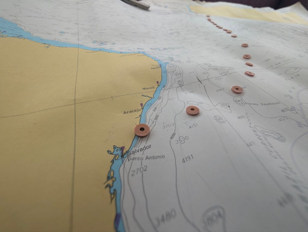 Inmiddels beginnen we af te tellen, nog iets meer dan tweehonderd mijl te gaan. Het is 1 mei en we zijn er bijna! We kijken terug op een goede oversteek. Heel comfortabel, wel zeven boeken heb ik kunnen lezen. Inmiddels hebben we koers gezet naar de stad Salvador.